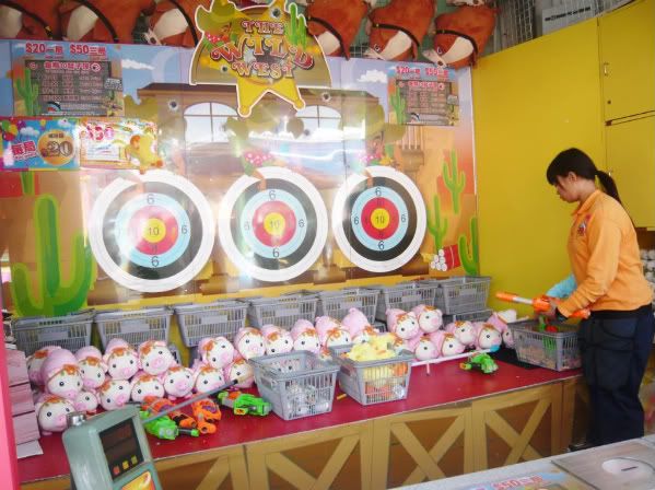 Try-your-luck booths!!!!!! I got Kenny to play this Nerf gun game for me (obviously I paid for the games) and he won the little piggy (in picture) for me! Adorable much. ♥